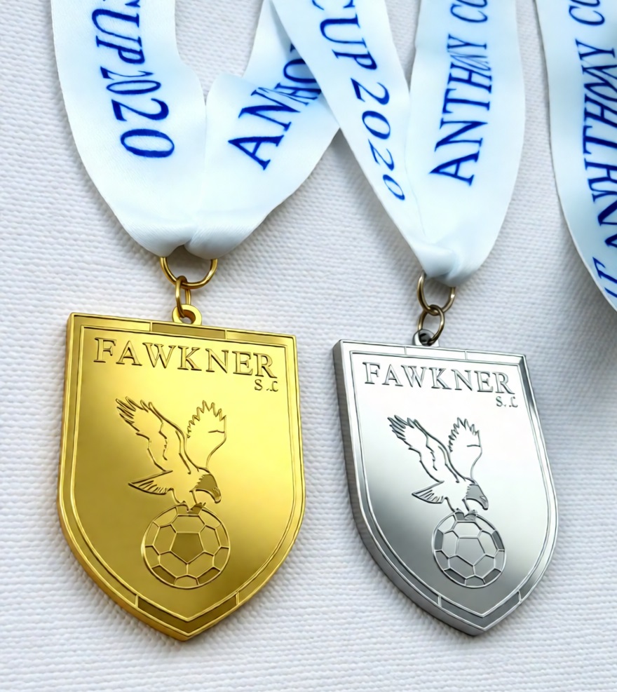 Football medals in gold and silver crafted for Fawkner Soccer Club tournaments, featuring shield designs, zinc alloy casting, and premium plating. Ideal as club medals for awards, team recognition, or special soccer events, combining durability, elegance, and team pride.